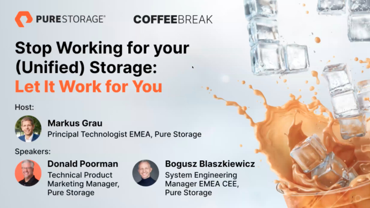 This month, host Markus Grau invites Donald Poorman, Technical Product Marketing Manager and Bogusz Blaszkiewicz, System Engineering Manager CEE from Pure Storage to Coffee Break to explore all things file, unified storage, and Pure’s approach in the unified block + file space.