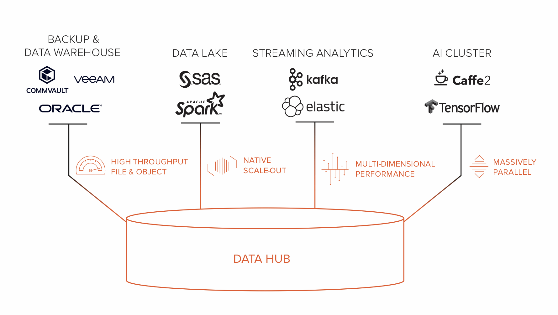 It’s time to rethink storage. A data hub is designed on first principles not only to store data, but to unify and deliver data. Unifying data means that the same data can be accessed by multiple applications at the same time with full data integrity. Delivering data means each application has the full performance of data access that it requires, at the speed of today’s business. Data hub shatters legacy infrastructure barriers where applications are given their own silos and replicated datasets.