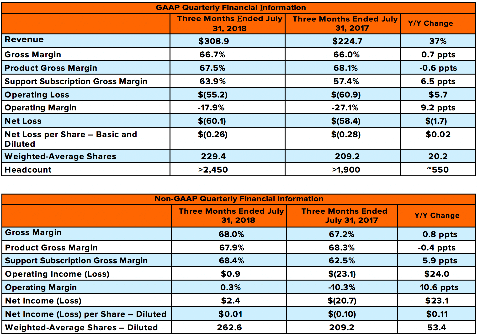 下表顯示我們截至2018和2017年7月31日為止的合併財報數據摘要(未經稽核,除百分比、每股金額與人數之外,單位皆為百萬美元):